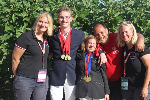 Bereits am ersten Tag fand die English Equitation Prüfung statt, in der die Reiter in kleine Gruppen eingeteilt werden und von den Richtern einzeln oder gemeinsam Hufschlagfiguren angesagt bekommen. Christian Adler und Nicoline Tscherne konnten sich sehr rasch auf die Leihpferde und ungewohnten Kommandos einstellen und dabei jeweils eine Goldmedaille gewinnen. Mittwoch war Dressur an der Reihe. Christians Pferd wurde ausgetauscht, da Tekken für den großen jungen Mann doch etwas klein war. Nun kam er mit dem ziemlich triebigen Frency zwar nicht so gut zurecht, machte jedoch das beste aus der Situation und mit seinem sehr schönen Sitz und seiner einfühlsamen Hilfengebung konnte er punkten. Auch Nicoline ritt mit der Haflingerstute Sotto die Dressur ihres Lebens und somit gab es auch an diesem Tag zwei Goldmedaillen, worauf die beiden TrainerInnen Susanne Müller und Julia Klauser besonders stolz sein können. Im Trailbewerb zeigte Christian wieder eine sehr schöne Vorführung und erreichte damit unglaublicher Weise wieder Gold, Nicoline hatte diesmal etwas mit der Angewohnheit ihrer Sotto bei den anderen Pferden bleiben zu wollen, zu kämpfen, konnte jedoch trotzdem eine Bronzemedaille gewinnen. Am letzten Tag stand für unsere beiden Reiter noch das Team-Relay auf dem Programm. In diesem Bewerb geht es nur um die Zeit, wobei die beiden nicht nur schön, sondern auch schnell ritten und damit ebenfalls wieder Gold holten.